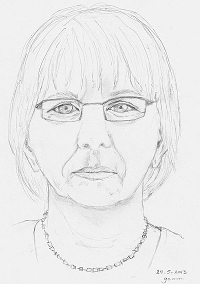 Three-quarter portraits from photos throw up extra challenges and I was glad to see that Ellie managed to get the tilt of the head and proportions of the subject although the right eye was not angled enough be able to sit on the tilt line of the eyes. Still, well observed and nicely drawn.